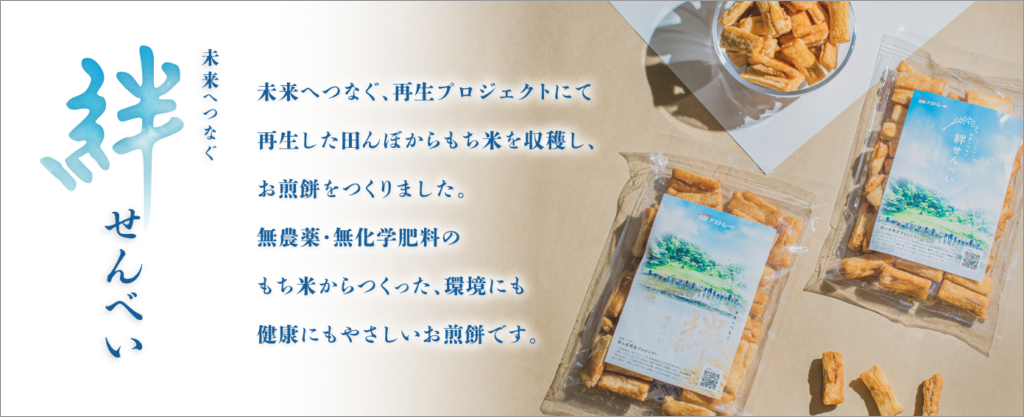 この度、2023年に約40年間耕作放棄地となっていた場所を田んぼとして再生し、霞ヶ浦周辺地域の方々や地場産業のご協力のもと、そこから収穫した無農薬のもち米を使用してお煎餅を製造いたしました。